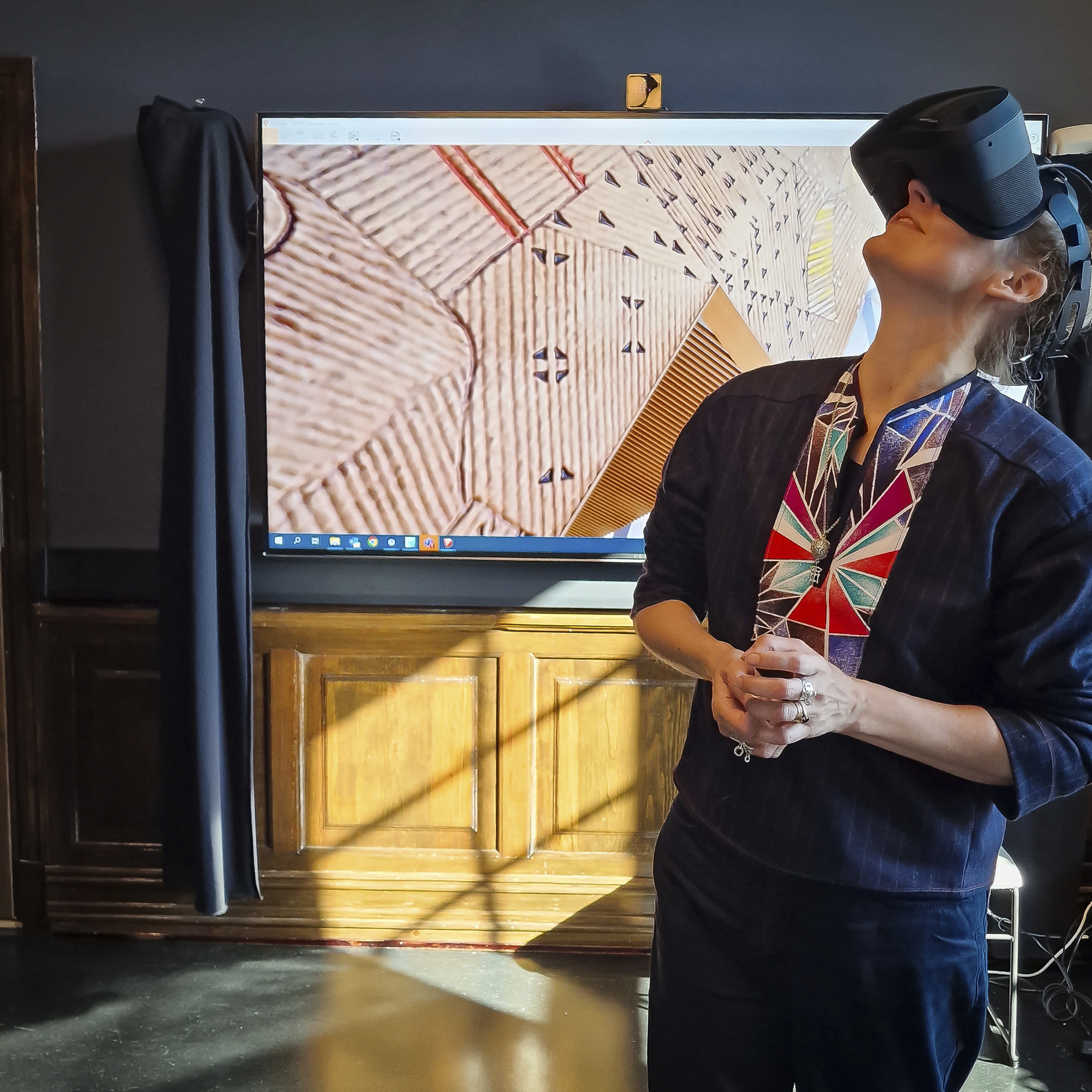 Outi Pieski admires her virtual work with VR goggles early in the process