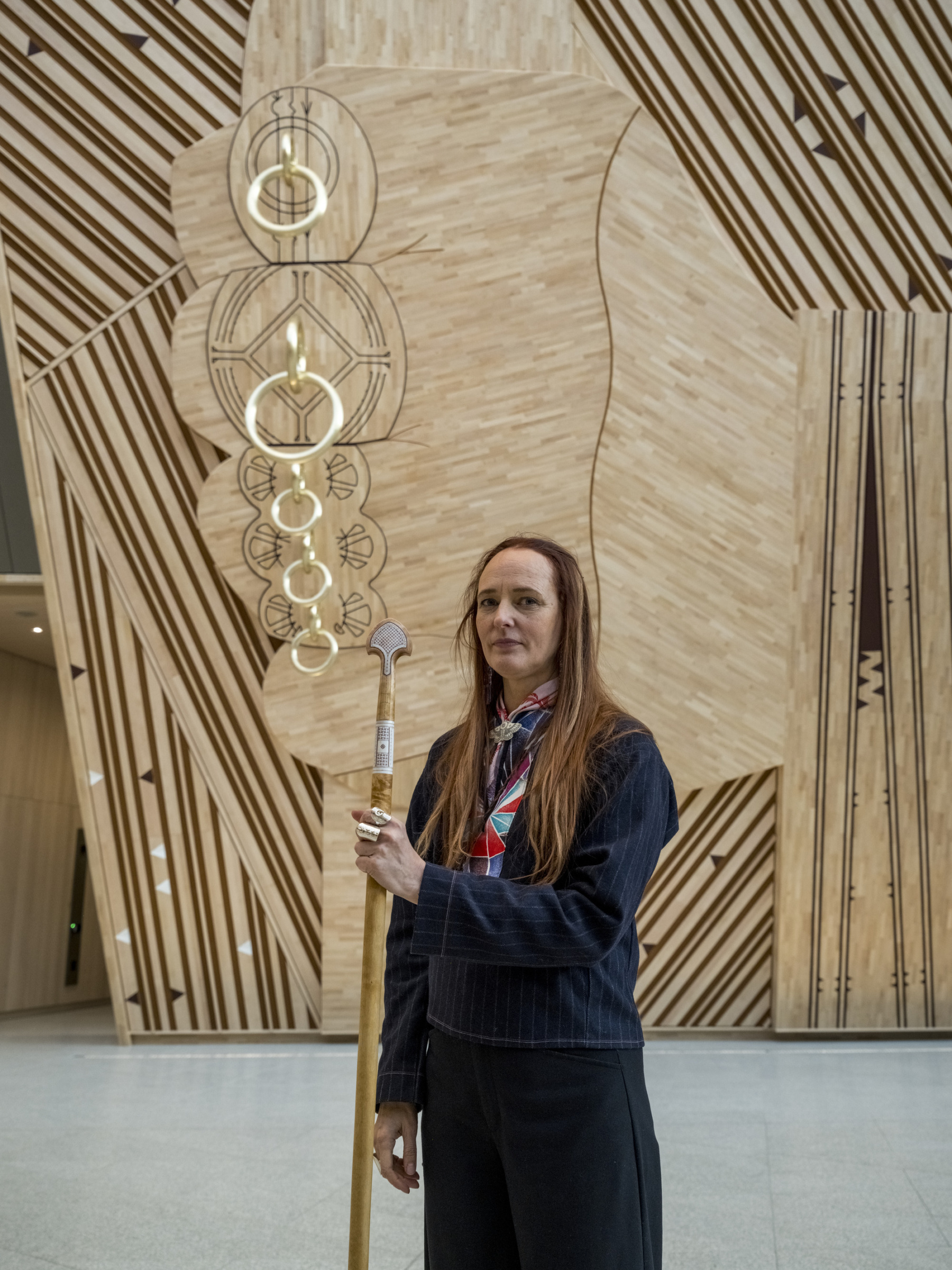 Outi Pieski describes AAhkA as an Indigenous monument in a state building – a bold presence in a space where decisions shaping Norway’s future are made.